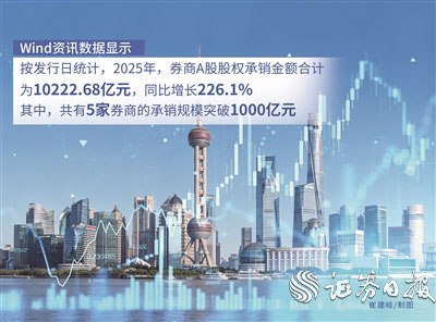 Wind资讯数据显示,按发行日统计,2025年,券商A股股权承销金额合计为10222.68亿元,同比增长226.1%。