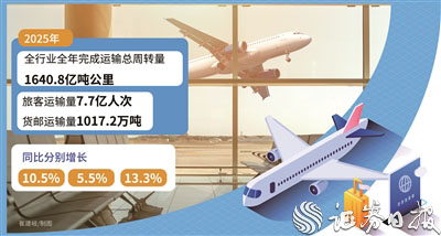 1月6日,2026年全国民航工作会议召开。中国民航局局长宋志勇在会上表示,2025年,全行业全年完成运输总周转量1640.8亿吨公里、旅客运输量7.7亿人次、货邮运输量1017.2万吨,同比分别增长10.5%、5.5%、13.3%。