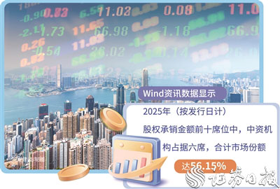 从港股市场股权承销业务格局来看,中资券商正日益占据引领地位。Wind资讯数据显示,2025年(按发行日计),股权承销金额前十席位中,中资机构占据六席,合计市场份额达56.15%。