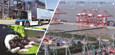 图②繁忙的上海港集装箱外贸码头 图③上海洋山口岸海关关员对智利车厘子进行查验 来源:视觉中国