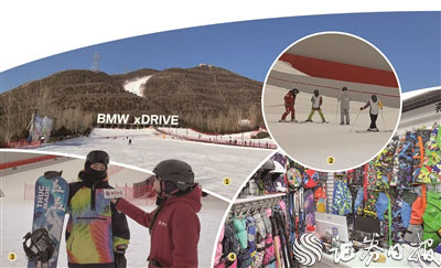 图①北京军都山滑雪场 图③正定热雪奇迹的滑雪爱好者在接受记者采访 图④义乌小商品城琳琅满目的冰雪装备 张芗逸/摄