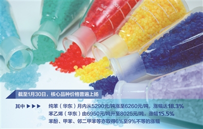 1月份以来,芳烃系产品成为化工板块表现最亮眼的品类之一。Wind资讯数据显示,截至1月30日,核心品种价格普遍上扬,其中,纯苯(华东)月内从5290元/吨涨至6260元/吨,涨幅达18.3%;苯乙烯(华东)由6950元/吨升至8025元/吨,涨幅15.5%;苯酚、甲苯、邻二甲苯等亦取得6%至9%不等的涨幅。