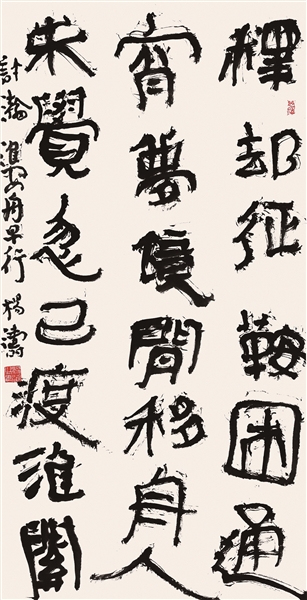 恰如杨涛所言:“书法是千百年来中华精神的诠释和物化。”他力求“借有为之手唤醒真切,独朗真心,洞照心原……”至此,已足见书翁之意不在书,乃在文化与思想。这正是当下书坛尤为稀缺的品质。书以载道,无道何以成书?哲思、文辞、书艺,乃至画境在交融中形成一片化机,可谓书法之至高境界。由此也可以说,在杨涛君的书法世界里,有了浓郁的形而上意味。在通往这高渺的艺术之境过程中,他找到了无限宽广的空间。他踏实地在现代生活的体验中,感悟时代审美的内在需要,以一步一石的追求,践行着其风神独赏的书法之梦。