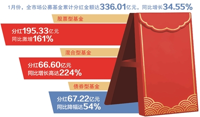 公募排排网数据显示,1月份,全市场公募基金累计分红金额达336.01亿元,同比增长34.55%。其中,权益类(股票型+混合型)基金异军突起,分红金额占比从去年同期的约38%大幅跃升至近78%,一举取代债券型基金成为绝对主力,标志着公募基金从“重规模”向“重回报”转型进一步深化。
