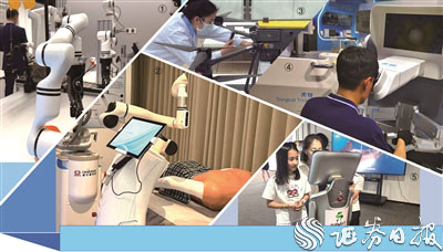 图④术锐技术人员演示手术机器人操作流程 图⑤尚睿通教育机器人与学生互动 郭冀川/摄