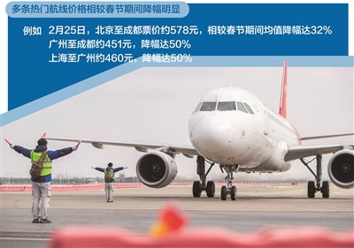 以2月25日为例,多条热门航线价格相较春节期间降幅明显。北京至成都票价约578元,相较春节期间均值降幅达32%;深圳至北京约762元,降幅达36%;广州至成都约451元,降幅达50%;上海至广州约460元,降幅达50%;上海至深圳约563元,降幅达35%。