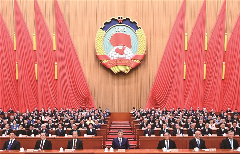 三月的北京,春启华章。人民大会堂大礼堂灯光璀璨,气氛隆重热烈。中国人民政治协商会议会徽悬挂在主席台正中,十面鲜艳的红旗分列两侧。