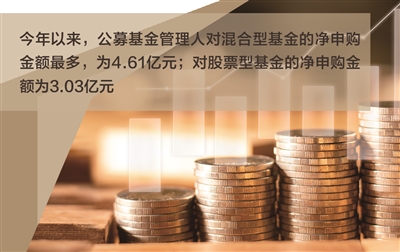 从公募基金管理人对各类产品的净申购金额来看,权益类基金是公募基金管理人自购重点对象。今年以来,公募基金管理人对混合型基金的净申购金额最多,为4.61亿元;对股票型基金的净申购金额为3.03亿元;此外,公募基金管理人对债券型基金、FOF(基金中基金)、QDII(合格境内机构投资者)基金的净申购金额分别为0.58亿元、0.50亿元、0.18亿元。