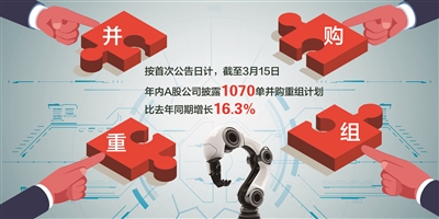 年内A股市场并购重组持续升温。同花顺iFinD数据显示,按首次公告日计,截至3月15日,年内A股公司披露1070单并购重组计划,比去年同期增长16.3%。其中,775单披露交易总价值,规模合计2367亿元;从进展来看,229单已完成。