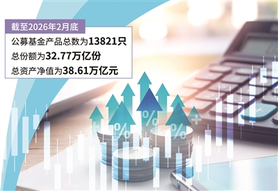 具体来看,截至2026年2月底,公募基金产品总数为13821只,总份额为32.77万亿份,总资产净值为38.61万亿元。与2026年1月底相比,基金数量增加了96只,总份额增加8620亿份,总资产净值增加8397.78亿元。