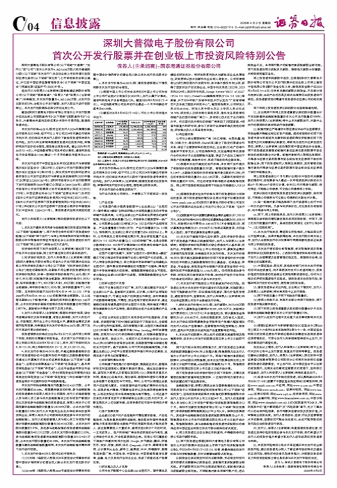 截至《深圳大普微电子股份有限公司首次公开发行股票并在创业板上市招股意向书》(以下简称“《招股意向书》”)公告日,大普微尚未盈利且存在累计未弥补亏损风险,敬请投资者关注。