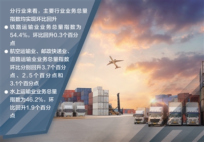 具体来看,业务总量指数回升明显,民生物流需求较快增长。业务总量指数为50.2%,环比回升2.7个百分点。分行业来看,铁路运输业业务总量指数为54.4%,环比回升0.3个百分点。航空运输业、邮政快递业、道路运输业业务总量指数环比分别回升3.7个百分点、2.5个百分点和3.1个百分点。水上运输业业务总量指数为46.2%,环比回升1.9个百分点。