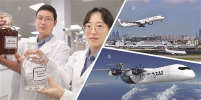 图①中国石化工作人员展示生物航空煤油图②中国东航航班正在起飞图③空客氢能源飞机概念图公司供图