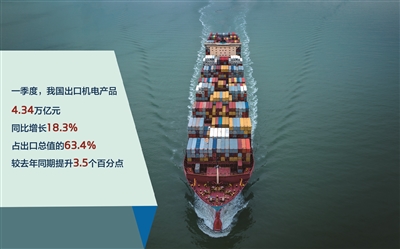 4月14日,海关总署副署长王军在国新办新闻发布会上表示,一季度我国出口机电产品4.34万亿元,同比增长18.3%,占出口总值的63.4%,较去年同期提升3.5个百分点。其中,电动汽车、锂电池、风力发电机组及其零件等绿色产品出口分别增长77.5%、50.4%和45.2%。