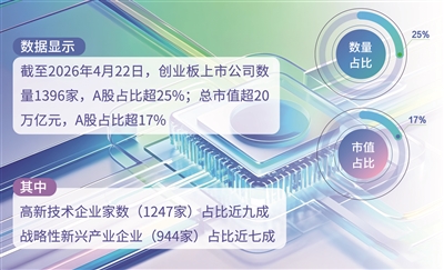 数据显示,截至2026年4月22日,创业板上市公司数量达1396家,A股占比超25%;总市值超20万亿元,A股占比超17%。其中,高新技术企业家数(1247家)占比近九成,战略性新兴产业企业(944家)占比近七成。