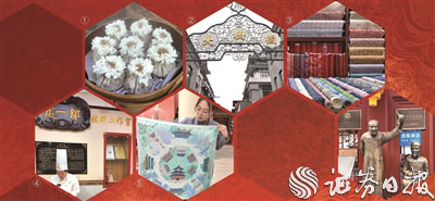 图④吴华侠现场展示烧麦制作技艺 图⑤张冰晶介绍瑞蚨祥产品 图⑥某中华老字号店前的雕塑 刘萌 孟珂/摄